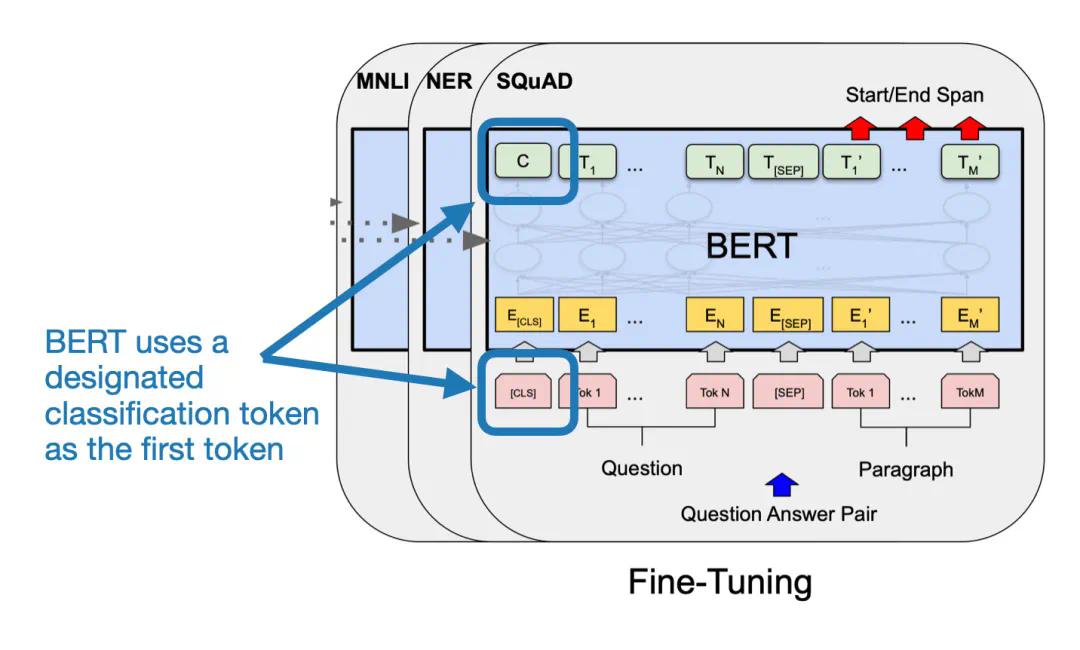 如果你熟悉 BERT(Devlin et al. 2018)等编码器式语言模型,你可能知道这些模型有一个指定的分类 token 作为其第一个 token,如下图所示: