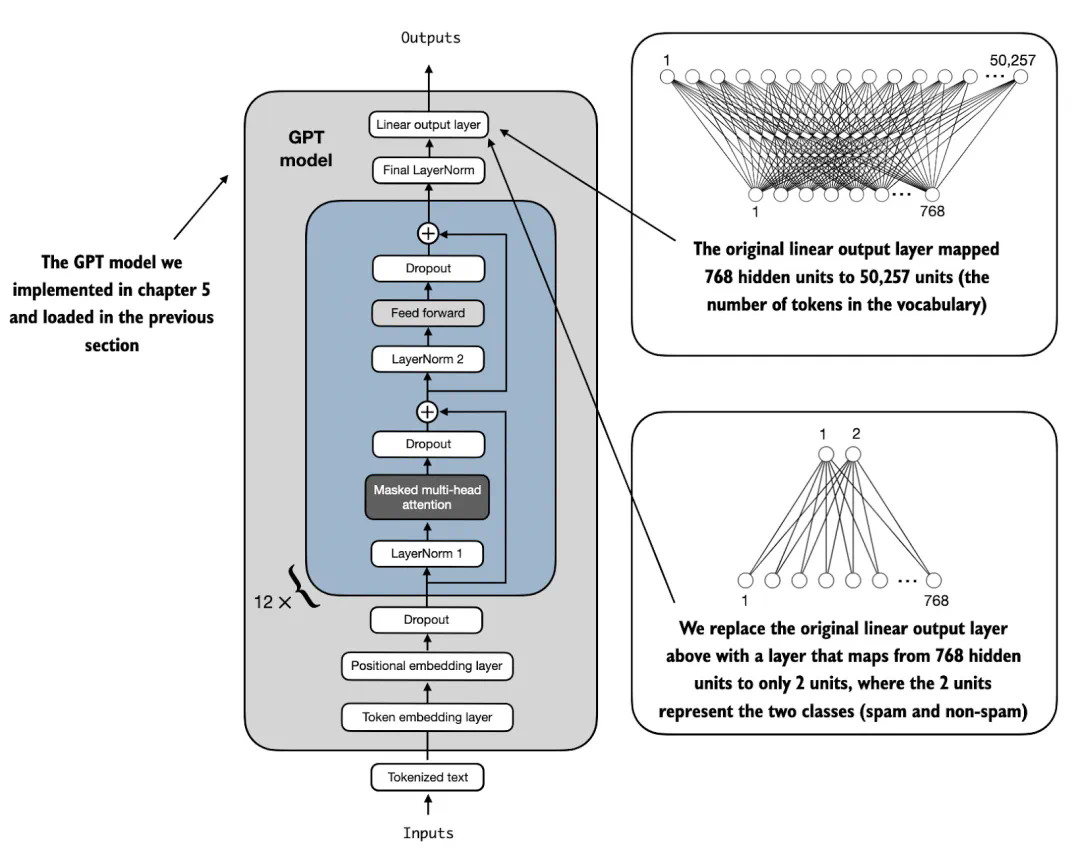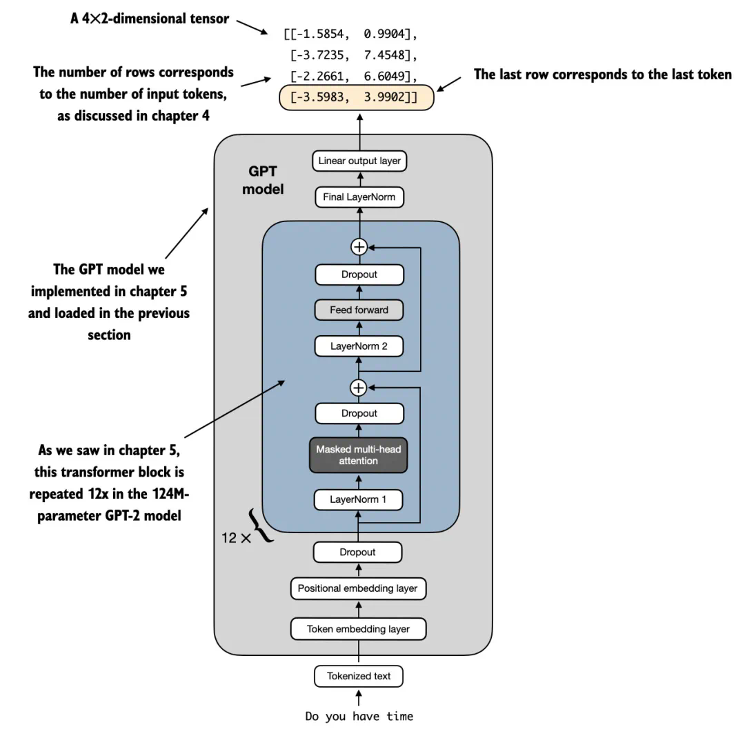 torch.manual_seed (123)num_classes = 2model.out_head = torch.nn.Linear (in_features=BASE_CONFIG ["emb_dim"],out_features=num_classes)