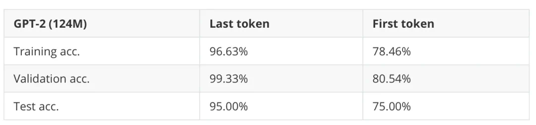 表 2:微调 GPT 模型中的最后一个 token 与第一个 token。