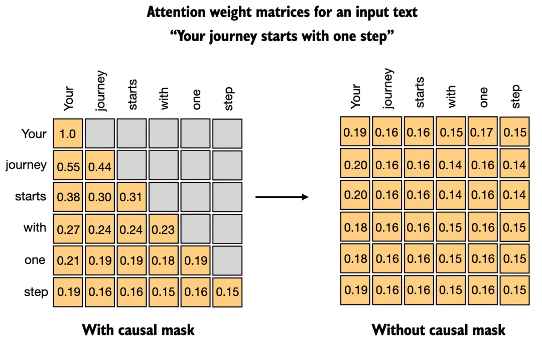 注意力机制建立了每个输入 token 与其他 token 之间的关系,为了让「注意力」集中,需要用到因果注意力掩码。它的原理是限制每个 token 只关注自己和前面的 token,如下图 7 所示: