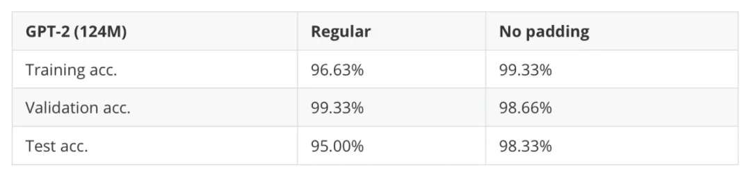 表 8:有无 padding 时,GPT-2(124M)的训练准确率、验证准确率和测试准确率变化。