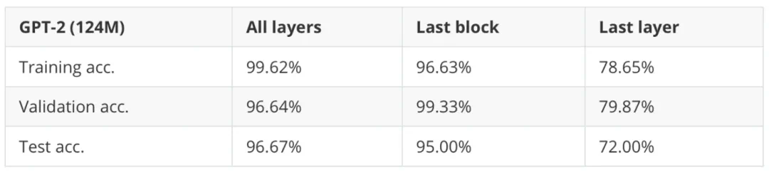 但是,你可能想知道如果不更新所有层,我们会留下多少预测性能。因此,在下表中,我对所有层、仅最后一个 transformer 块(包括最后一层)、仅最后一层进行了微调。