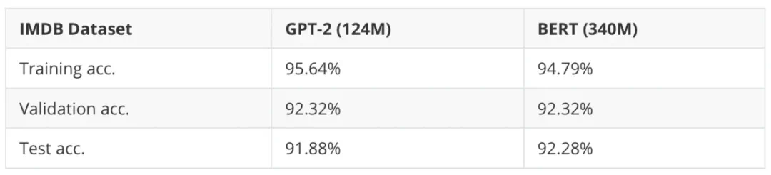 可以看到,BERT 模型的表现比 GPT-2 稍微好一点(测试准确率高 1%),但 BERT 的参数规模几乎是 GPT-2 的 3 倍。此外,数据集可能太小且太简单了,因此我又在 IMDB Movie Review 数据集上尝试比较了情感分类表现(即预测观看者是否喜欢一部电影)。