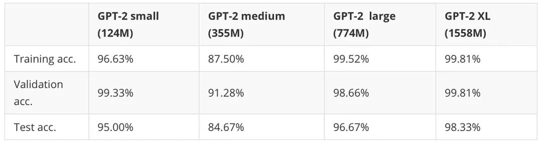 目前为止,我们只看到了最小的 GPT-2(124M)模型的性能,那么与规模更大的 GPT-2 变体相比如何呢?比如 GPT-2 medium(355M)、GPT-2 large(774M)和 GPT-2 XL(1558M)。结果如下表 6 所示。