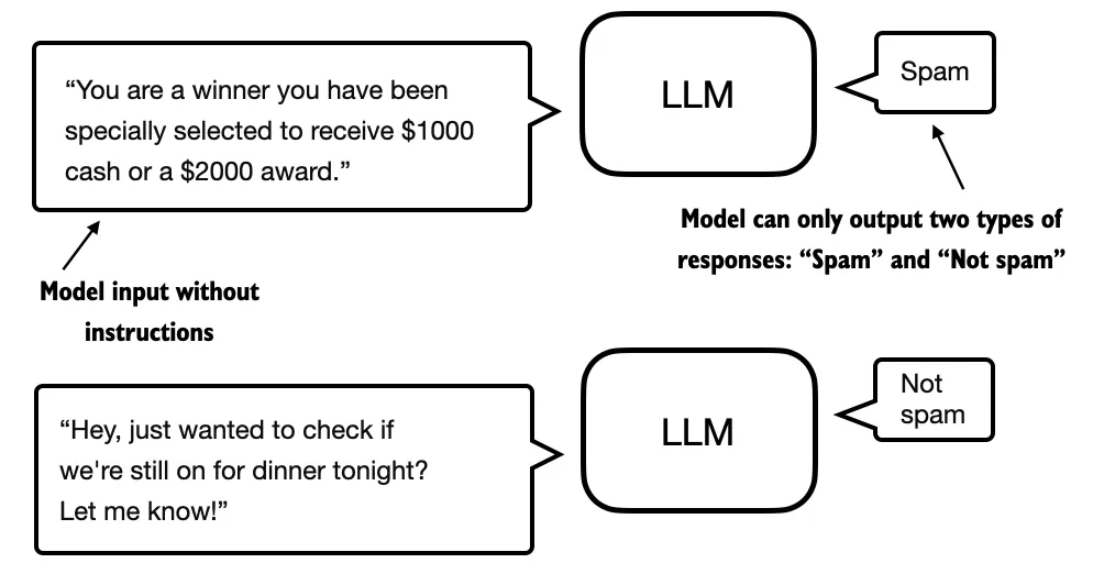 图 2:一个使用 LLM 进行垃圾邮件分类的示例。针对垃圾邮件分类微调的模型在输入时不需要额外的指令,然而,与指令微调模型相比,它的回答只能是「垃圾邮件」和「非垃圾邮件」。