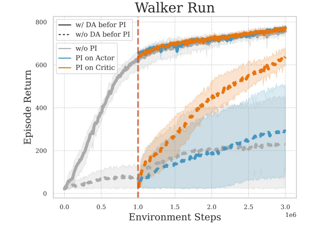 在初始 100 万步训练中不使用数据增强的情况下,对 Critic 实施可塑性注入会导致性能显著提升。相反,对 Actor 进行可塑性注入也并不能使智能体恢复正常训练。这一结果充分证明,Critic 严重的可塑性损失是造成视觉强化学习样本利用效率严重低下的关键原因。