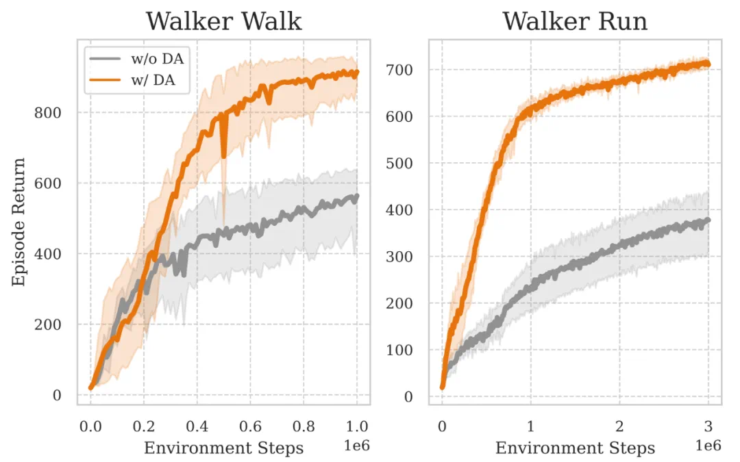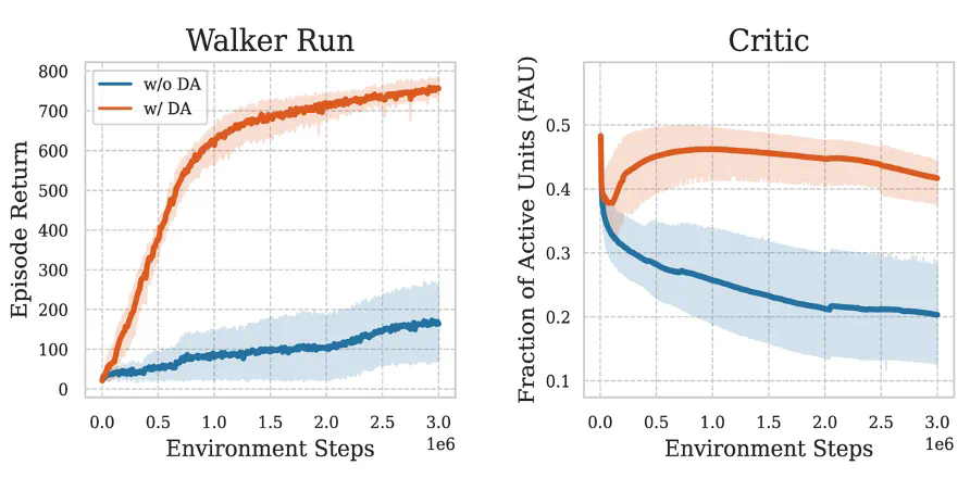在不使用数据增强的情况下,即使是简单的 Walker Walk 任务,智能体的性能在训练后期也明显停滞,表现出严重的可塑性损失。