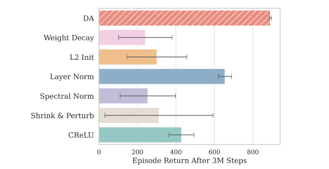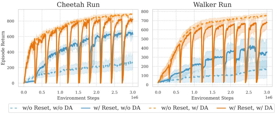 但当引入数据增强后,Reset 的实施只带来轻微的改善,有时甚至会导致性能下降。这一结果表明,只通过数据增强就能有效提升智能体的可塑性。