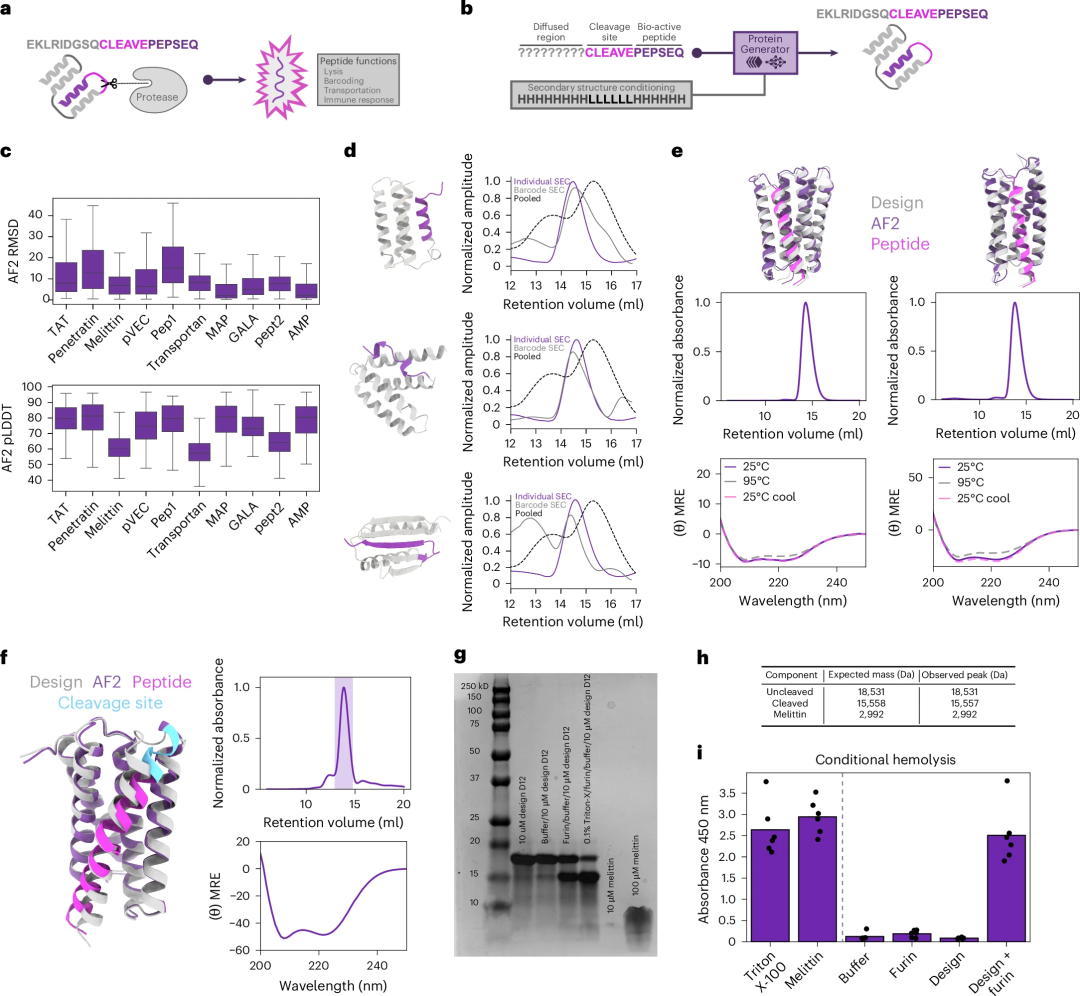 尽管蜂毒素在分离时处于无序状态,PG 仍能够生成蜂毒素序列呈螺旋结构的溶液,随后对其进行了实验测试。在 13 种实验表征的设计中,有 5 种通过 SEC 可溶且单分散,通过 CD 折叠成螺旋二级结构且具有热稳定性。