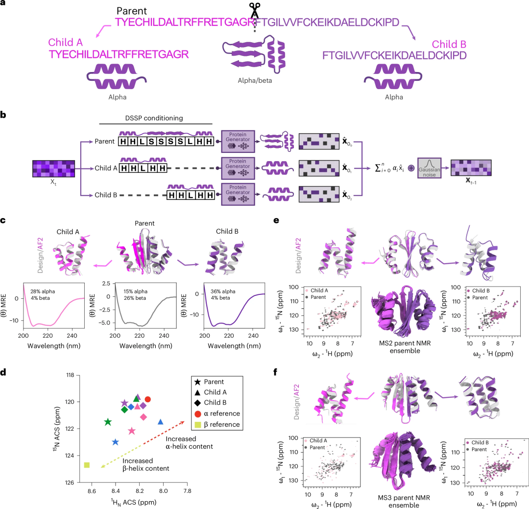研究人员通过对有不同结构约束的扩散轨迹之间的序列对数进行平均,设计了多状态父子蛋白质三元组(multistate parent–child protein triples),其中相同的序列在父级中完整时折叠成不同的超二级结构,而不是分裂成两个子域。