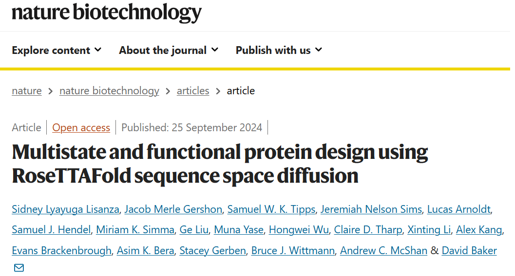 该研究以「Multistate and functional protein design using RoseTTAFold sequence space diffusion」为题,于 9 月 25 日发布在《Nature Biotechnology》上。