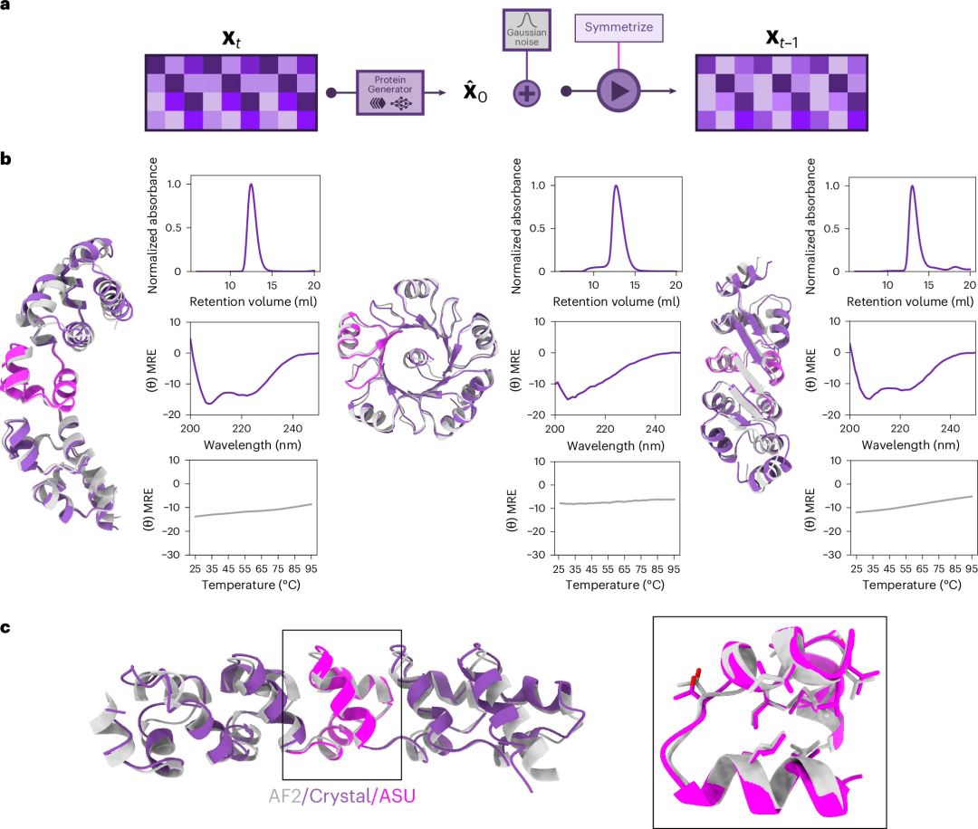 计算模拟和实验结果表明,PG 可以轻松从头生成各种蛋白质,这些蛋白质受到各种序列域约束的影响,包括氨基酸组成偏差、重复序列对称性、生物活性肽笼和多态设计。