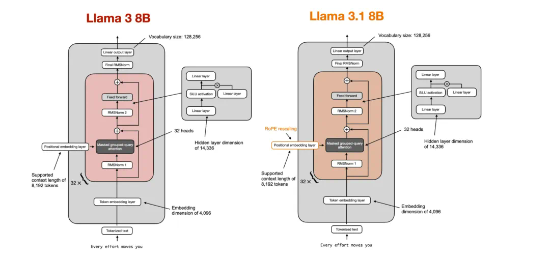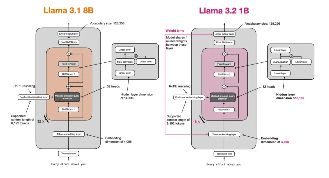 从上图可以看出,Llama 3.1 8B 和 Llama 3.2 1B 架构的主要区别在于各自的尺寸。