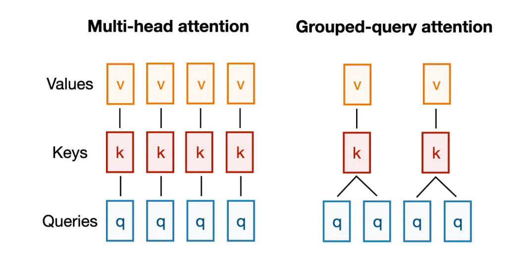 在 GQA 中,通过在多个注意力头之间共享来减少键和值投影的数量,每个注意力头仍有其独特的查询,但这些查询关注同一组键和值。