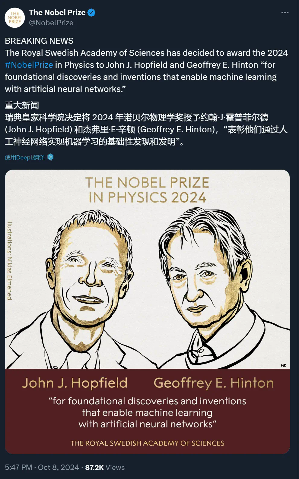 文章来源于互联网:刚刚,2024诺贝尔物理学奖授予Geoffrey Hinton、John Hopfield