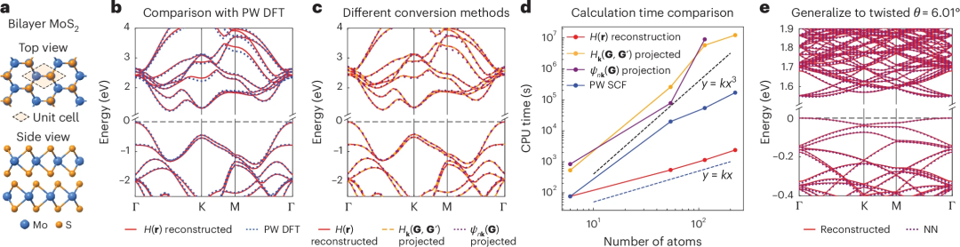 首先,在训练集的一个结构上对重建的哈密顿量进行基准测试,将其能带结构与使用 PW 计算的能带结构绘制在一起。如图 1c 所示,两个能带结构非常吻合。