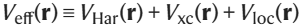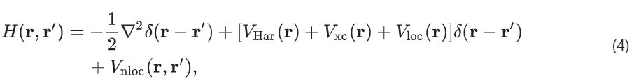 其中,各个项分别对应于动能、Hartree 势、交换关联势以及伪势的局部和非局部部分。本研究仅考虑交换和关联的半局部函数。方括号中的三个项称为总有效局部势: