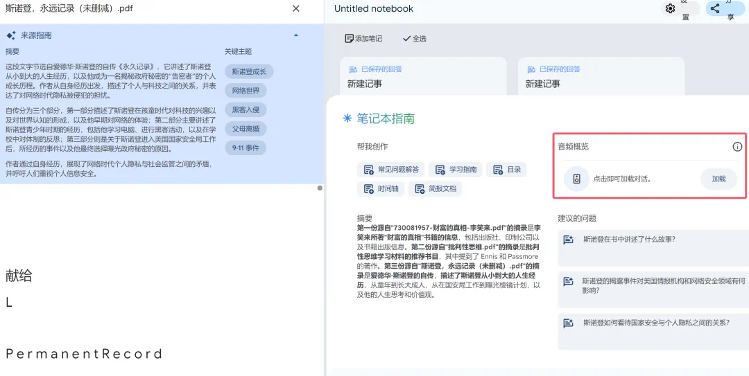 我上传了斯诺登的传记,很厚的一本书,选择「音频概览」: