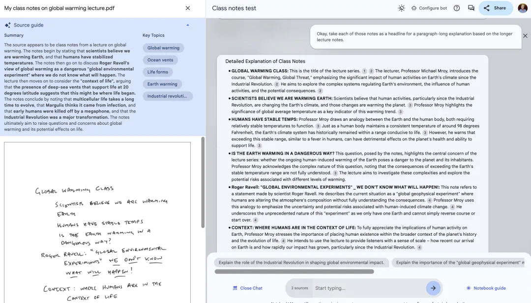 喂它一个文档,它能立刻将文档变成一个播客、一份学习指南、一个常见问题解答集合、时间轴、提纲,还能和它畅聊。