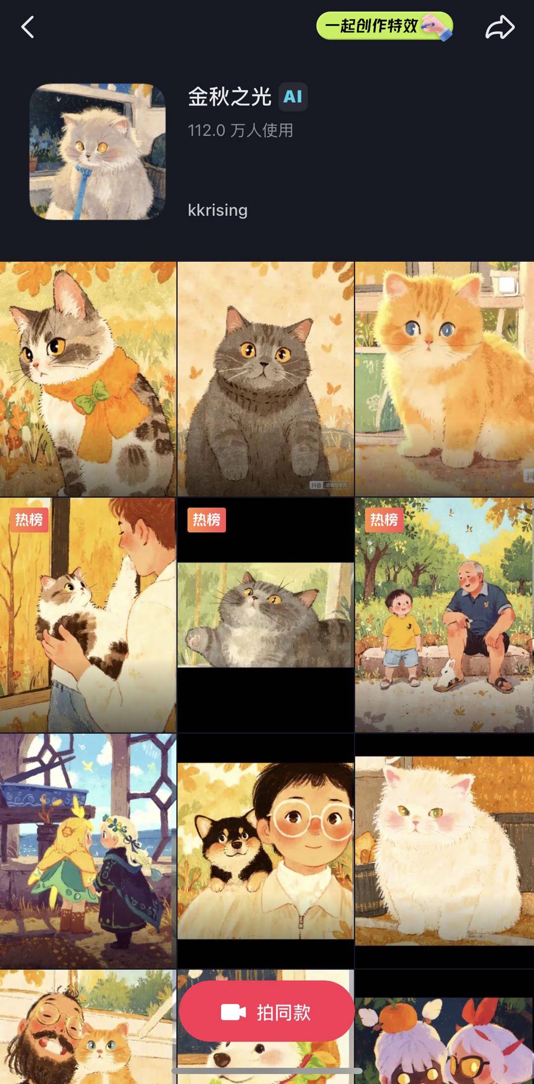 近期,抖音特效团队还在国庆期间上线了同样是温暖治愈系的“金秋绘本风特效”,特效投稿已超百万,相关话题播放超过1.8亿。