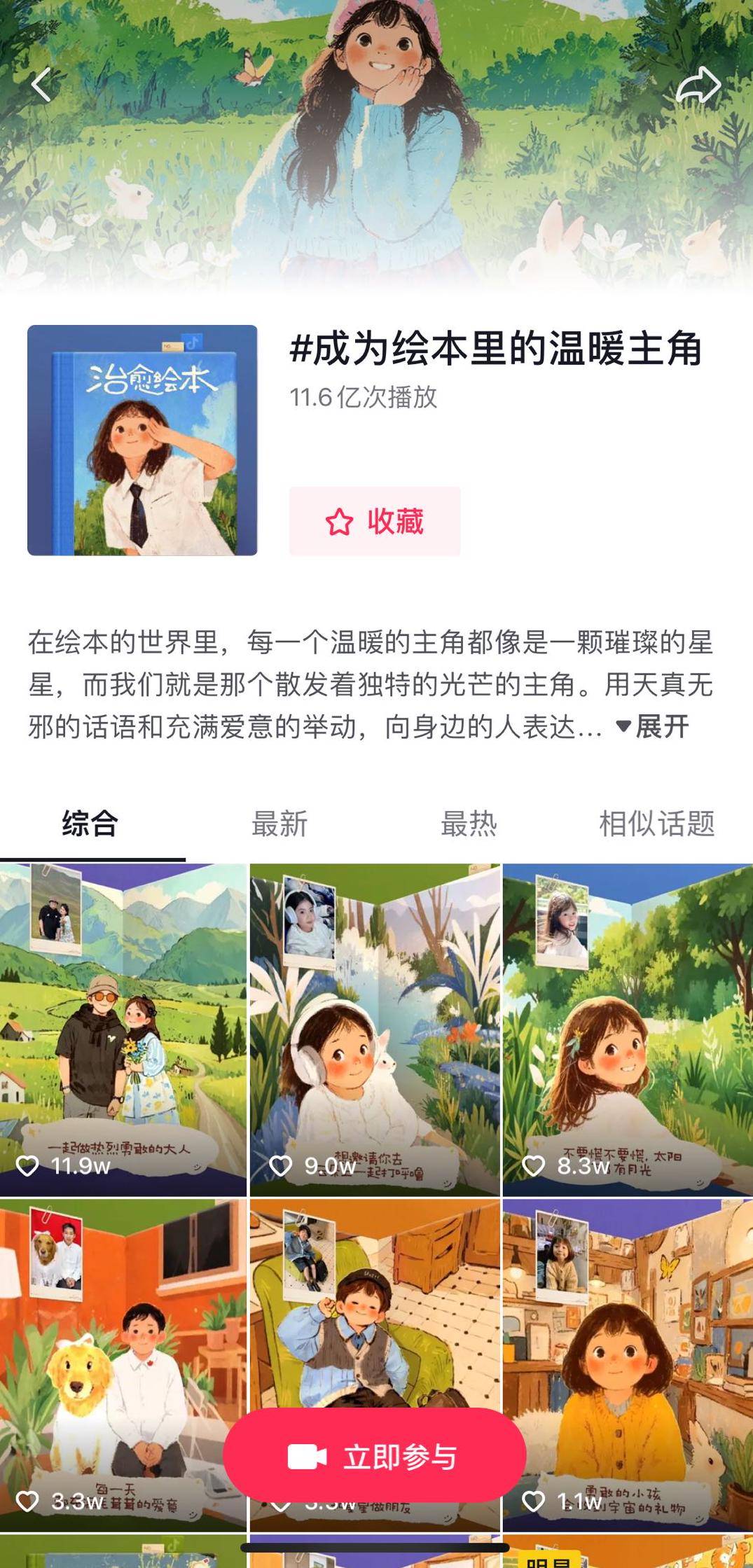 国庆期间,抖音上一款名为“AI治愈绘本”的特效凭借温暖优美的画风和高还原度吸引了数百万用户投稿,采用了动态绘本的拟物玩法,“AI治愈绘本”特效首次使用了3D立体翻书的形式,巧妙地将首张用户图作为书皮呈现,玩法新颖有趣。基于该特效投稿的“成为绘本里的温暖主角”话题播放量超过11亿。