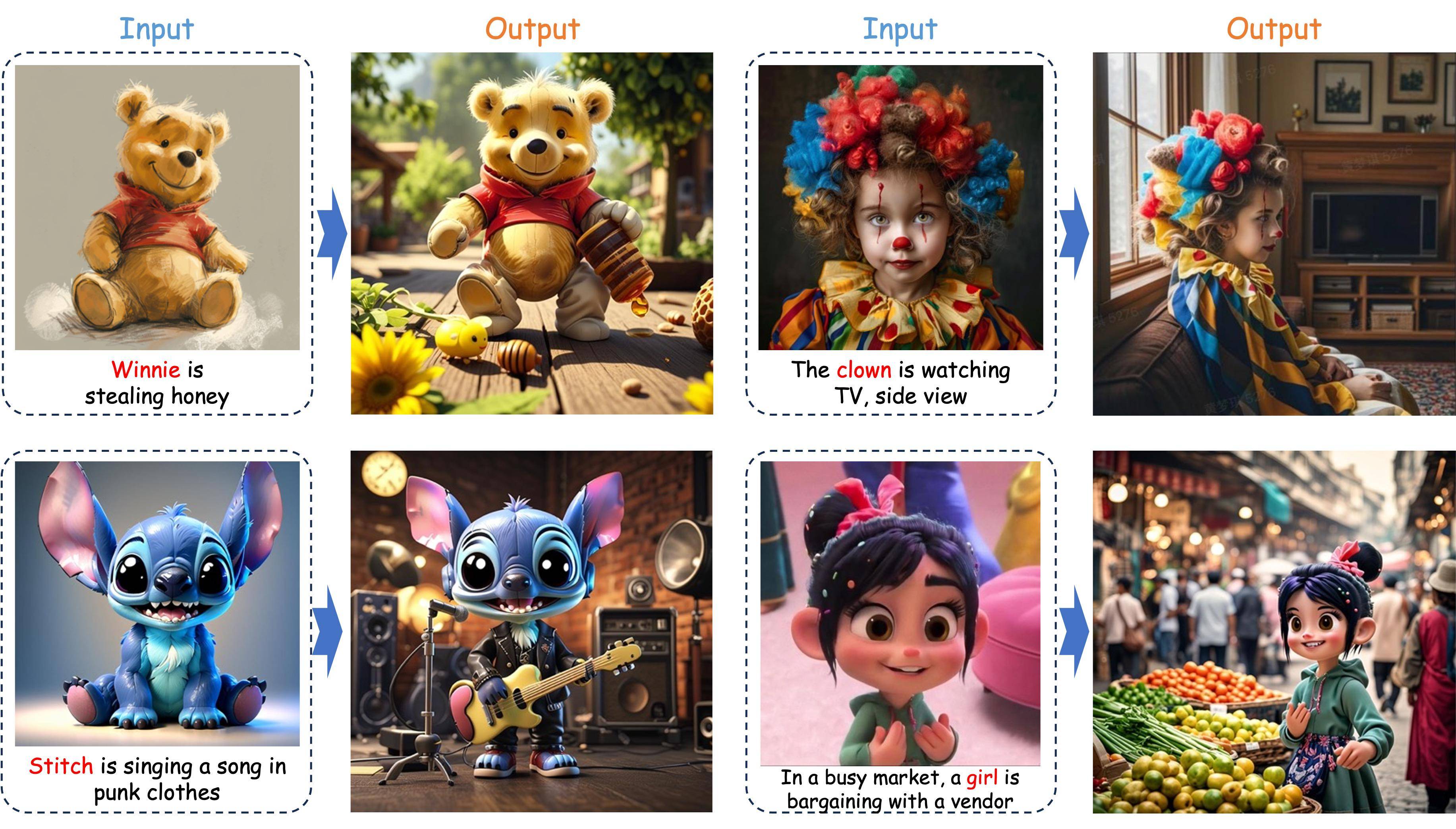 RealCustom是一种个性化定制技术即IP保持,对于任意开放域物体或人物 IP 均可实现无需微调的实时定制化生成,在AI绘本中主要起到保持输入图片特征的作用。不同于以往风格化特效中用的图片特征保持方法, RealCustom不仅能够还原图片的细节特征,还具有对图片的抽象语义理解,从而可以根据文本输入自适应地做出变化,并生成更加和谐的效果。为了更好的还原主体外观,RealCustom使用了多个层次的图片信息融合,为了让视觉信息跟文本信息能更好的融合,RealCustom 通过自适应模块学习了视觉条件与文本条件之间的对齐能力,并根据不同时刻的状态准确地推导出相应的视觉条件。从而能对用户多种多样的输入做出自适应的处理,在保证好看的风格化效果的同时,稳定的保持图片特征。