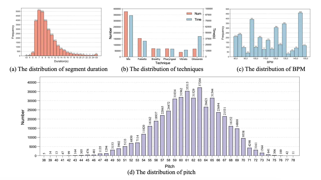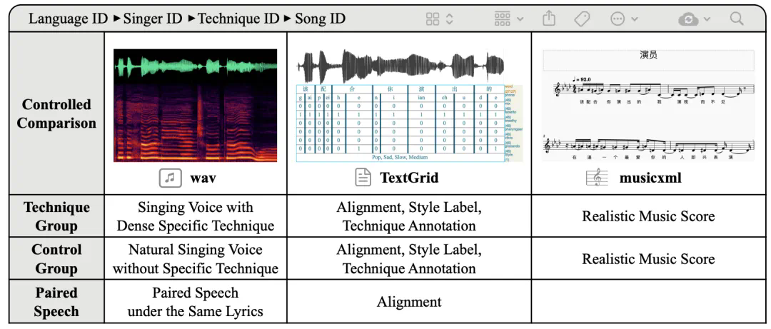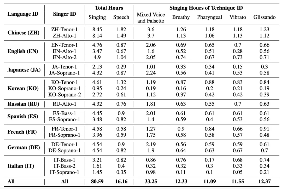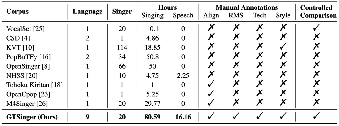 图 1:现有开源歌唱数据集的信息表。Speech 表示配对朗读数据。Align 和 RMS 分别表示人工音素对齐和真实乐谱。Style 表示全局风格标签。