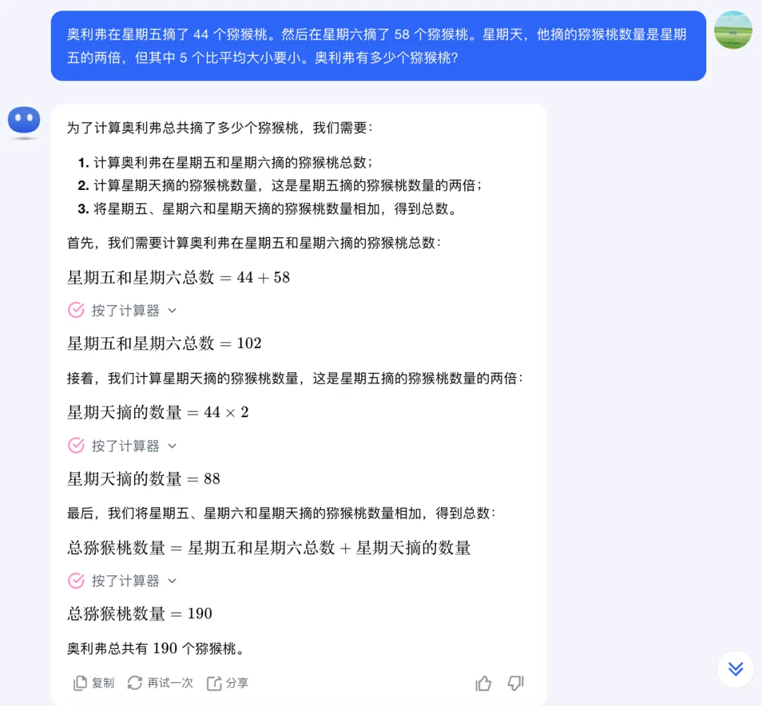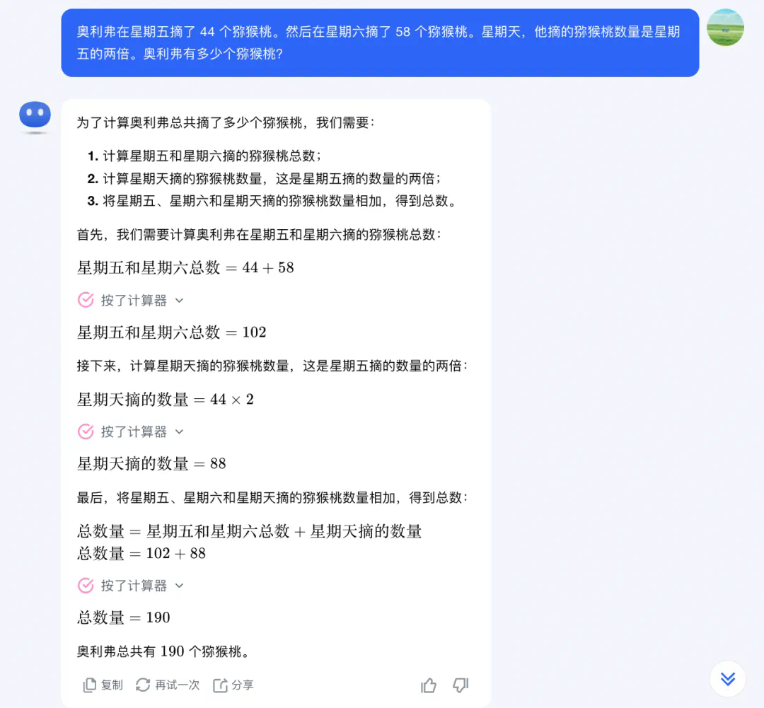先来个正常的:奥利弗在星期五摘了 44 个猕猴桃。然后在星期六摘了 58 个猕猴桃。星期天,他摘的猕猴桃数量是星期五的两倍,奥利弗有多少个猕猴桃?