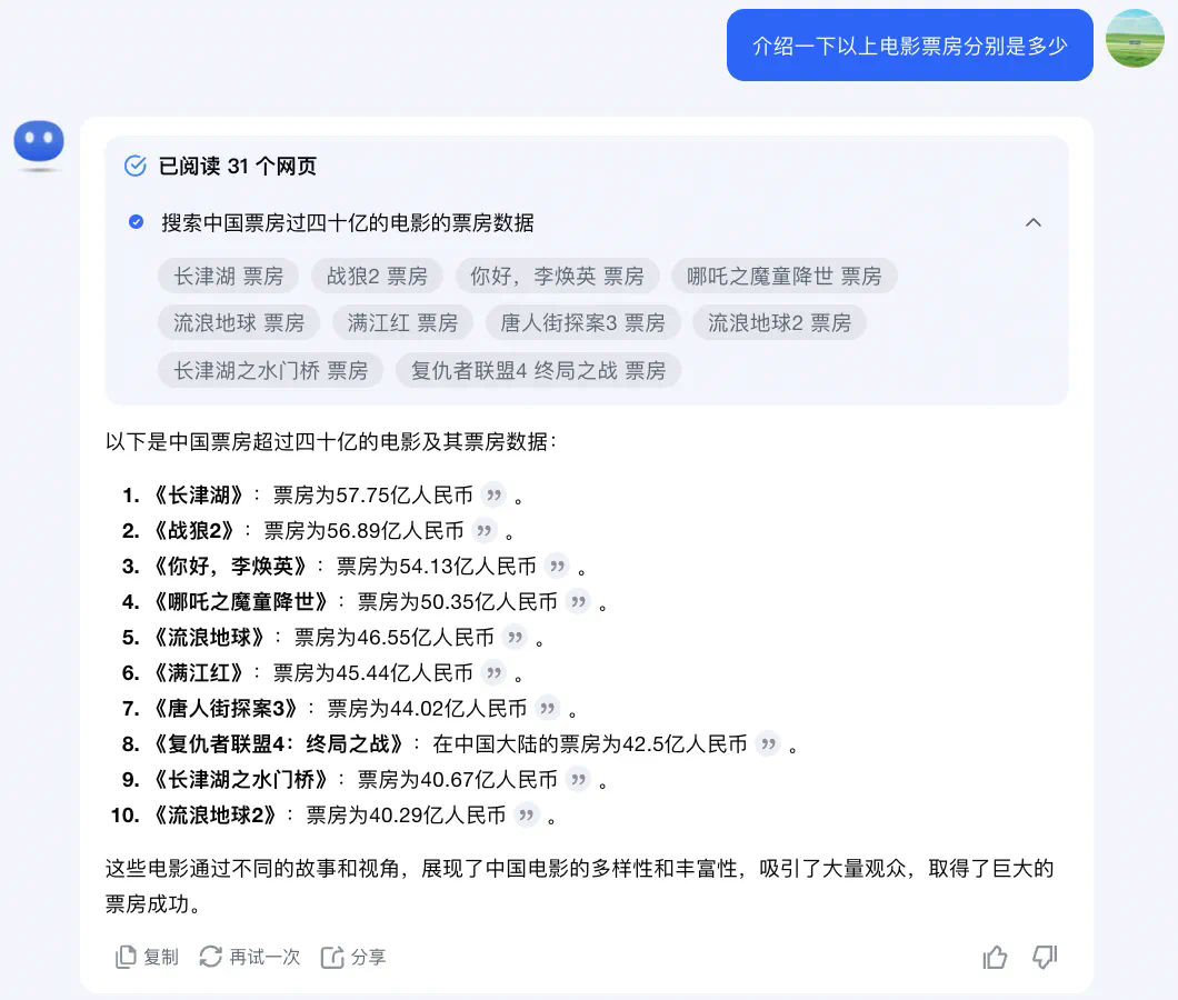 我们又让它来总结上榜的电影具体票房,其回答与搜索引擎上的结果一致。