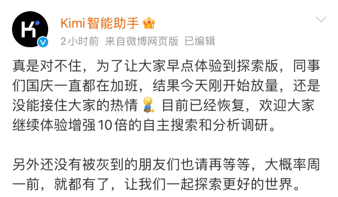 消息一出,不少体验者纷纷涌入官网,「Kimi 崩了」也一度登上热搜。