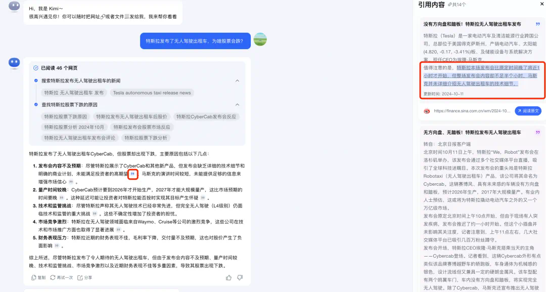 如果我们点击它回答中的小引号,界面右侧则会显示出引用的原文信息,这极大地降低了幻觉发生的可能性。