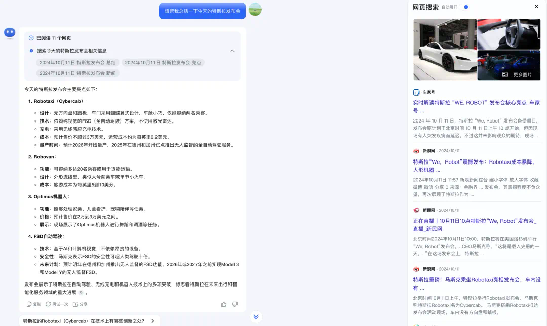 它阅读了 11 个网页,并在界面右侧显示所有的搜索结果,从中提取出四大亮点,分别是 Robotaxi、Robovan、Optimus 机器人和 FSD 自动驾驶,还分条缕析地介绍了它们的功能、设计、成本等。