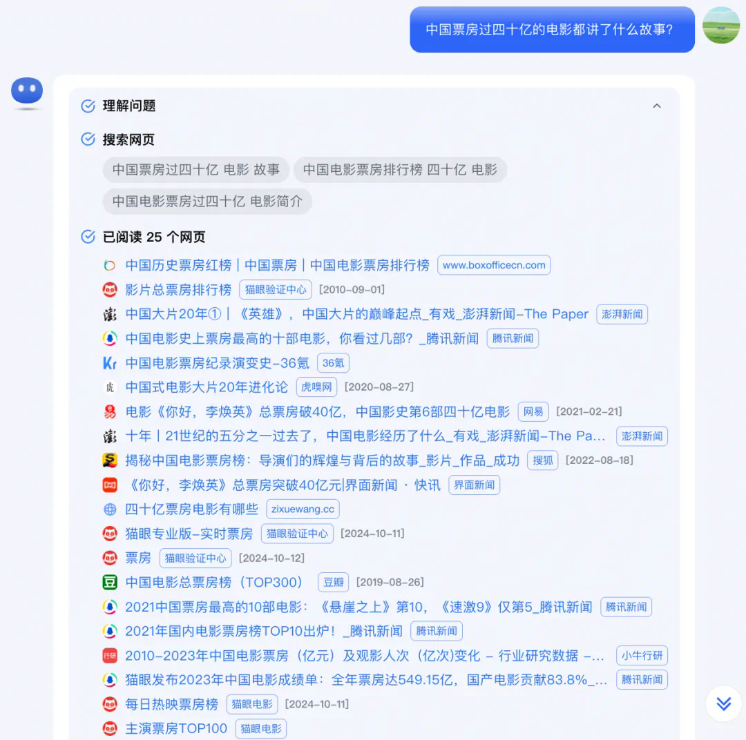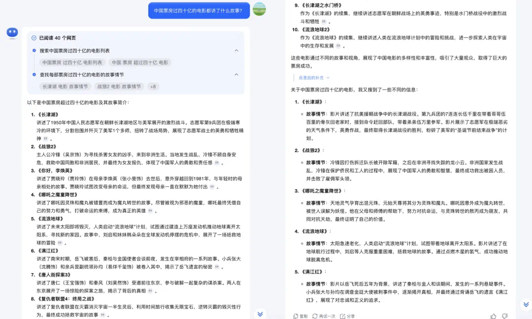 具体来说,它先全网搜索中国票房过 40 亿的电影,然后查找这些电影的故事情节介绍。