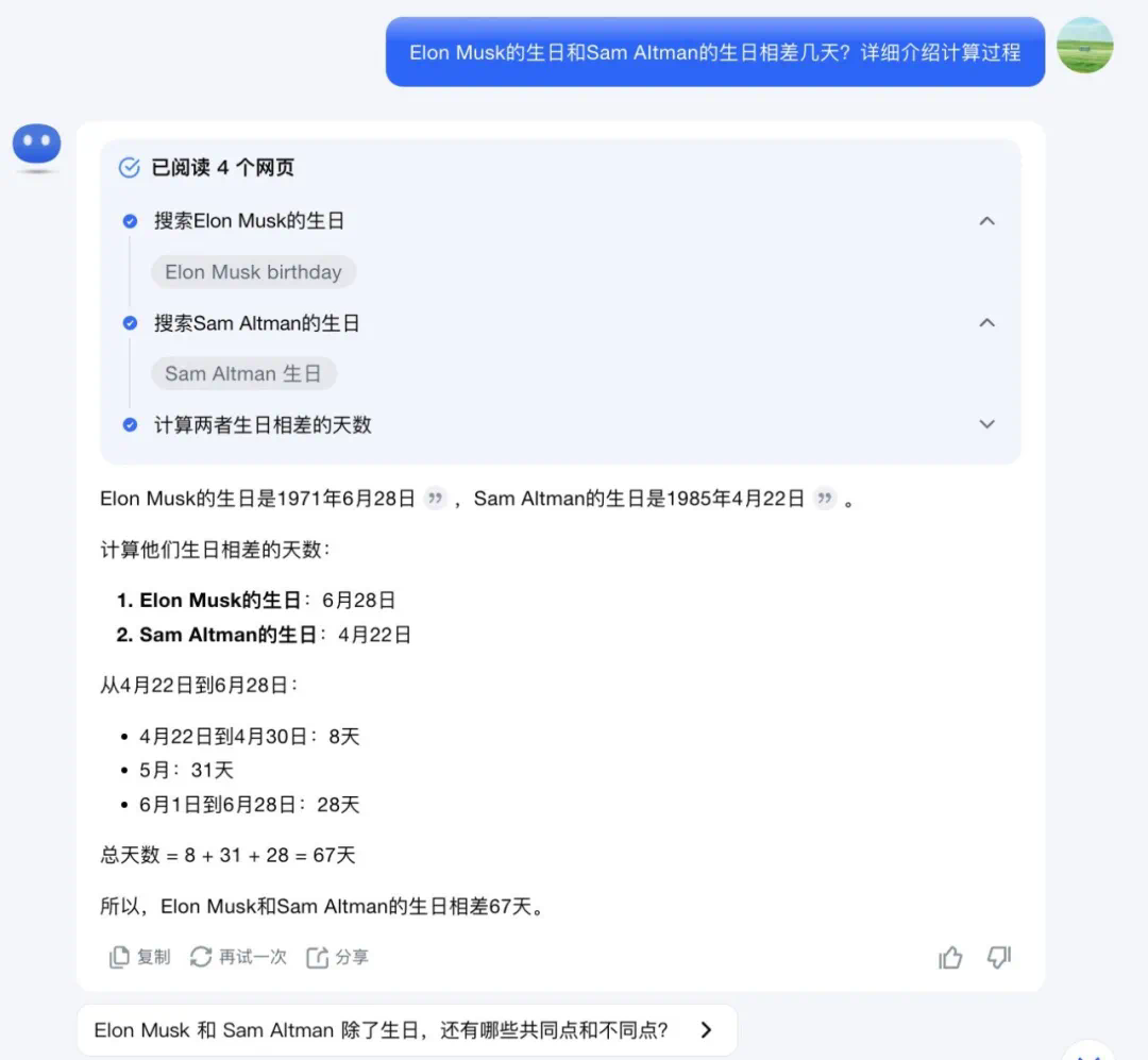 农历的计算方法过于复杂,我们也搞不清楚,因此,就让 Kimi 探索版再计算一下马斯克和奥特曼的生日差。