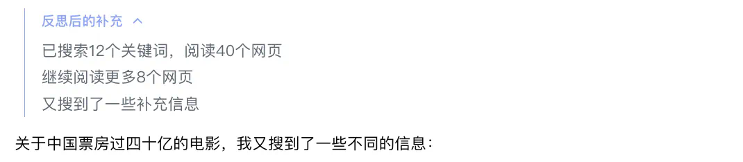 此外,它还能即时反思搜索结果,在发现第一次回答中的情节简介存在信息缺失时,会主动补充更多内容。