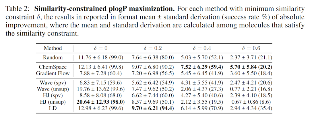 实验表明ChemFlow及相关基于流的方法在多种相似度约束下都取得了较好的优化效果,尤其是在中等约束(δ = 0.2, 0.4)时,表现出较高的成功率和更好的优化。同时,基于福克-普朗克方程流约束的生成方法在所有相似度约束下都获得了最高的成功率。