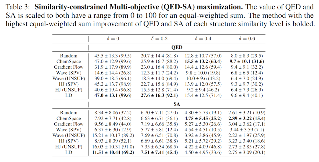 实验结果显示,ChemFlow在多目标优化任务中,同样表现出色,能够生成在各个属性上均具有良好表现的分子。