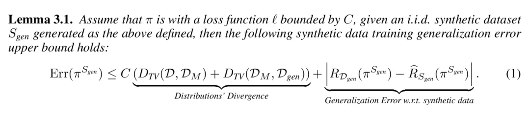 的泛化误差上界分为了两个部分,分别是 “分布间的散度” 和 “与合成数据有关的泛化误差” 。