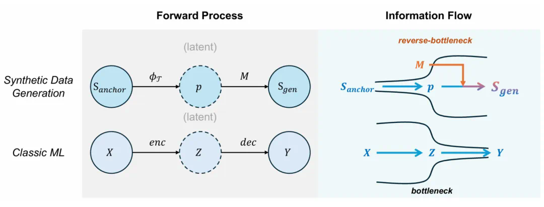 事先预训练的,导致从信息流的视角下二者具有相反的性质。如图 6 右侧所示,在合成数据的生成过程中,信息量是一个被扩充的过程。
