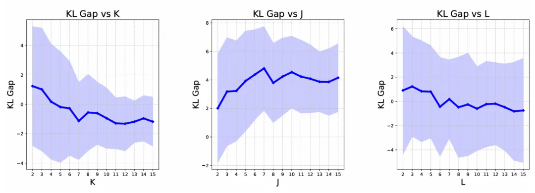 从图 7 中可以看出,更大的信息增益能有效提升 KL Gap,即提升了使用合成数据训练的模型相比于未使用合成数据的模型对 ground-truth 的拟合结果。此外,对其他变量的改变也相应的影响了 KL Gap 的结果,进一步验证了这一结论。