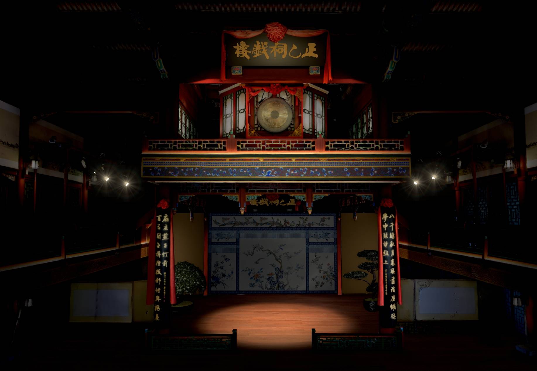 「虚拟直播间」的另一个场景北京正乙祠戏楼始建于清康熙6年,是中国历史上第一座木制结构的室内剧场,被誉为“中国戏楼活化石”。与二郎庙戏台稍显粗犷的风格相比,正乙祠戏楼的构造布局更为复杂精巧,讲求光影明暗搭配等舞台细节的美感。