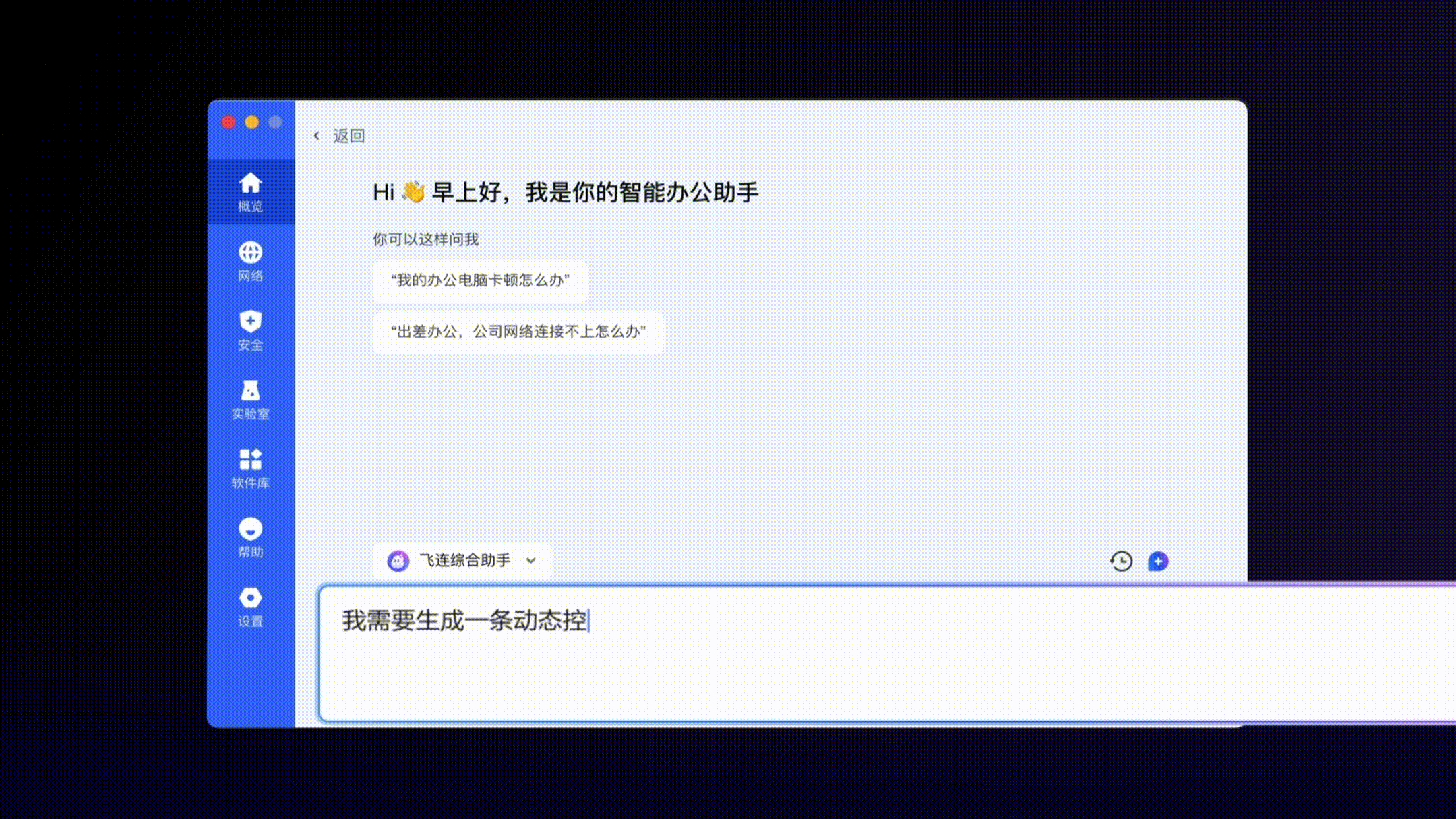 比如,当IT管理员在飞连智能助手中,用自然语言方式下达一条动态控制策略时,飞连会展示具体的参数组合并询问是否提交实施,当给出确定答复后便会自动执行策略;员工也可以直接问询飞连智能助手相关电脑问题,飞连会给出设备报告和诊断结果,在得到员工授权的前提下自动解决问题。此外,企业还可以在飞连后台搭建合同审核助手、财务智能助手等多个智能体,完成资源授权发布。