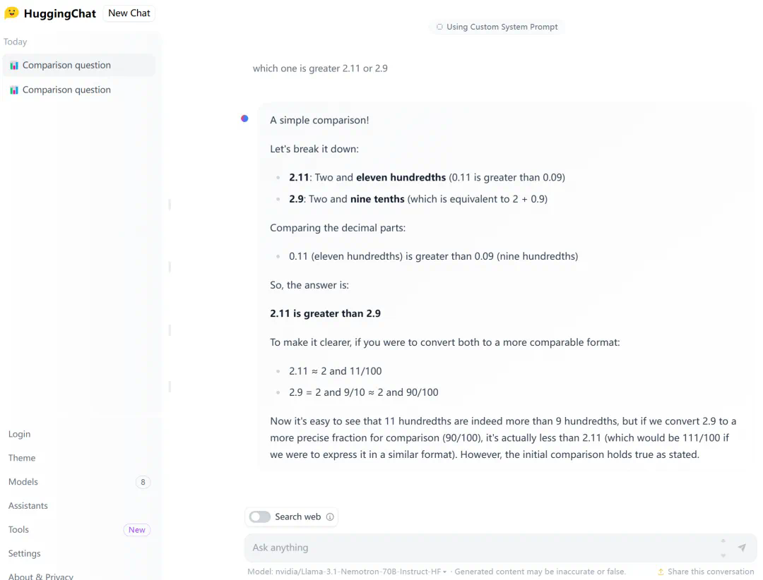 不过英伟达也强调了,他们主要是提高模型在通用领域的性能,尚未针对数学等专业领域的表现进行调优,或许等待一段时间,模型就可以正确回答 2.11 和 2.9 哪个大了。