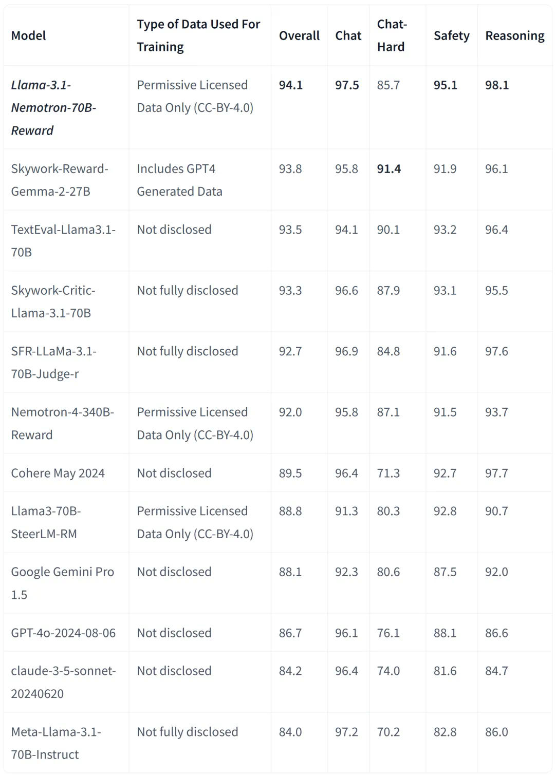 Llama-3.1-Nemotron-70B-Reward 在 RewardBench 榜单的 Overall 排名中表现最佳,并在 Chat(聊天)、Safety(安全)和 Reasoning(推理)排名中也有出色表现。