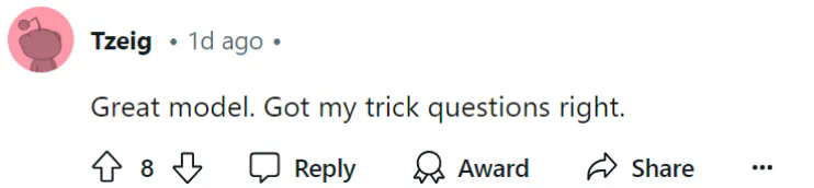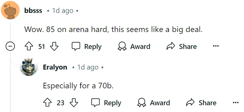 对于这一成绩,有网友表示,在 Arena Hard 基准上拿到 85.0 分,对于一个 70B 的模型来说,确实是件大事。