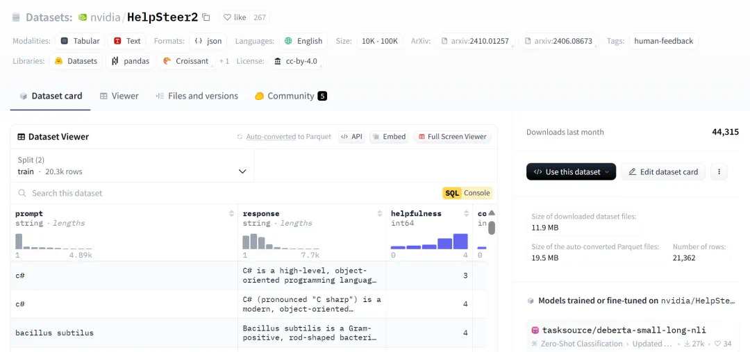 数据集地址:https://huggingface.co/datasets/nvidia/HelpSteer2