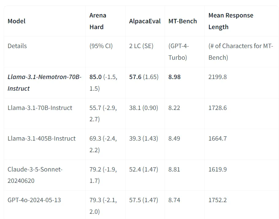 截至 2024 年 10 月 1 日,Llama-3.1-Nemotron-70B-Instruct 在三个自动对齐基准中均排名第一,击败了 GPT-4o 和 Claude 3.5 Sonnet 等强大的前沿模型。