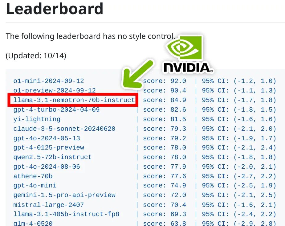 从下图中大模型榜单可以看到, Llama-3.1-Nemotron-70B-Instruct 的性能仅次于 OpenAI 最新 o1 大模型了。