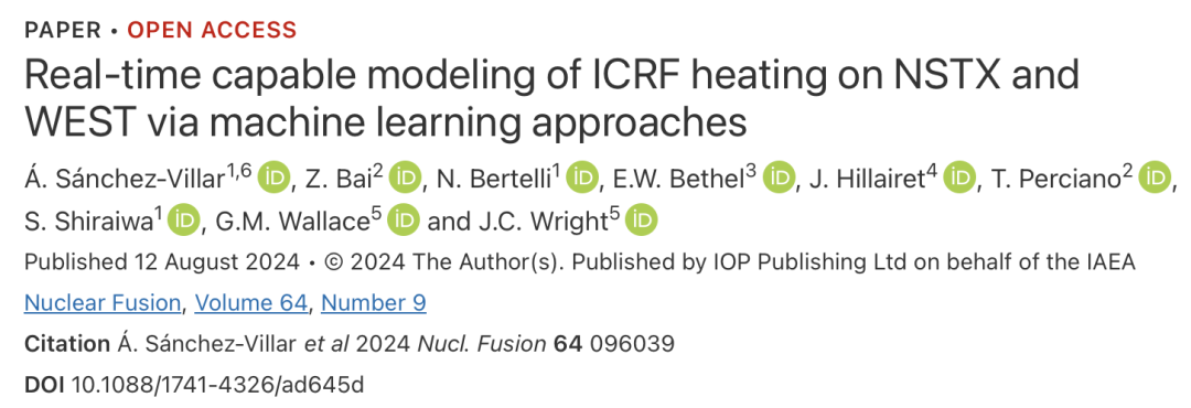 该研究以「Real-time capable modeling of ICRF heating on NSTX and WEST via machine learning approaches」为题,于 2024 年 8 月 12 日发布在《Nuclear Fusion》。