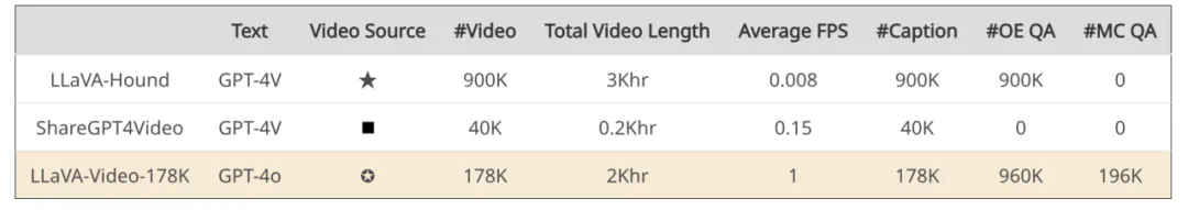 LLaVA-Video-178K 和其他视频语言数据集的比较。平均 FPS 代表用于提示 GPT-4o/GPT-4V 进行注释的每秒帧数。★:VIDAL, WebVid, ActivityNet。◼:Panda-70M, Pexels, Pixabay, Mixkit, BDD100K, Ego4d。✸:HD-VILA-100M, Kinetics-700M, Ego4D, VidOR, InternVid, YouCook2, ActivityNet, Sth-sthv2, VIDAL, Charades。